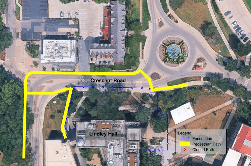 | Sept 11, 2025 | March 2026 | Sidewalk in front of Ritchie and Lindley Halls along Crescent Road | Starting September 11, the sidewalk in front of Ritchie and Lindley Halls will close to allow work on the north side of Lindley's foundation. The closing will move foot traffic to the north side of Crescent Road. Pedestrians should use the crosswalks west of Chi Omega fountain and on the west side of the Crescent Road and Naismith Drive Intersection; see attached map. The exterior stairs between Lindley and Ritchie will be closed. The project will not close roads, but drivers should be aware of the increase in pedestrians at the crosswalks and of heavy truck traffic in the area.